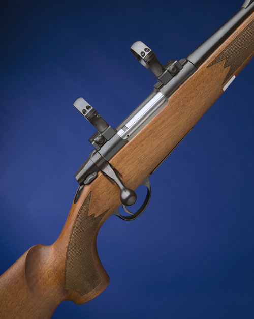 22 1/4in. nitro barrel with block-mounted open sights and ramp-mounted blade foresight, the receiver with telescopic sight mounts and rings, blued finish, hinged floorplate, 14 1/8in. pistolgrip stock with cheekpiece, chequered pistolgrip and fore-end, sling swivels and 3/4in. rubber recoil pad