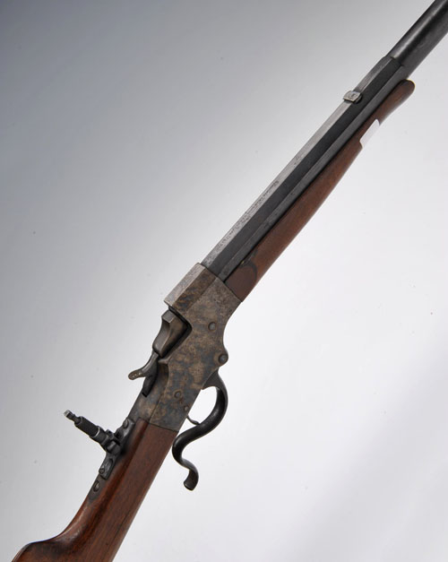 A .22 (LR) SINGLE-SHOT UNDER-LEVER TAKE-DOWN TARGET RIFLE SIGNED STEVENS, serial no. 7199, with heavy two-stage 26in. barrel (proved 2011), target fore-sight, peep-sight to the tang, colour-hardened receiver, walnut stock with 'Swiss-style' heel-plate and schnabel forend, in good condition