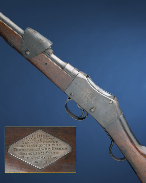 21in. blued nitro barrel (proved in 2010) with bead fore-sight with protective 'ears' rear tangent sight with leather cover, the left side of the action marked 'ENFIELD 1897 M.E. 303 C.C.I.' and stamped with 'VR' cypher, the right side markings indistinct, some external discolouration, various War Dept. inspection marks, 14in. stock with steel buttplate, the left side of the stock inlaid with a plaque engraved 'CHORD. W.A. BUSHMEN SERVICE CARBINE 87 TIMES UNDER FIRE. TRANSVAAL, CAPE COLONY, ORANGE FREE STATE, BEIRA TO MAFEKING, 1900-1901'