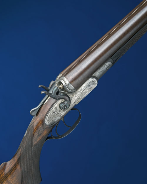 30 1/2in. nitro reproved damascus barrels (shortened), broad rib engraved 'PATENT SOLID STEEL THROUGH LUMP', and 'CHARLES BOSWELL. MAKER. EDMONTON. LONDON. N.', 2 7/8in. chambers, true cyl. in both, large treble-grip action incorporating C.G. Bonehill patent 'CAM TREBLE SAFETY BOLT', patent no. 3178 of 1877, carved percussion fences, broad strikers, rebounding sidelocks (some exterior pits to edges), border and scroll engraving, the underside with a running hare, brushed and reblued finish overall, 14 1/2in. well-figured pistolgrip stock with spearpoint drop points, horn pistolgrip-cap and buttplate, fore-end with Deeley & Edge patent release catch, weight 9lb. 10oz.