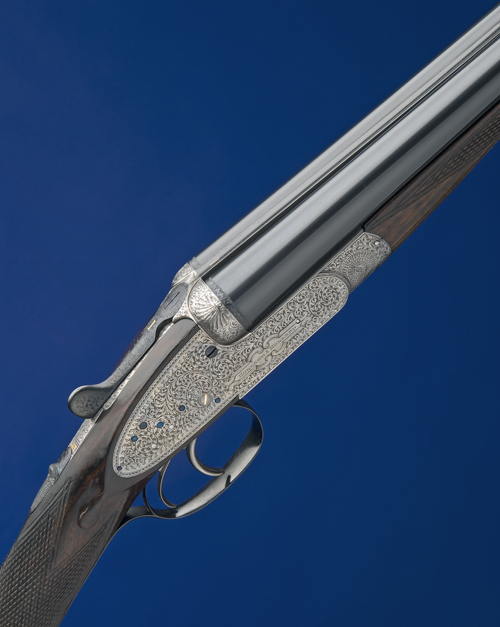 28in. sleeved nitro barrels (retaining original rib), 2 1/2in. chambers, bored approx. true cyl. and 1/4 choke, toplever gold-inlaid '1', carved shell fences, automatic safety with gold-inlaid 'SAFE' detail, gold-inlaid cocking-indicators, articulated front trigger, best bold acanthus scroll engraving, brushed bright and reblued finish overall, 15 3/4in. highly-figured stock including 2 1/4in. well-matched wooden extension, weight 5lb. 12oz, in a brass-cornered oak lined leather hammergun case with Holland & Holland trade label.