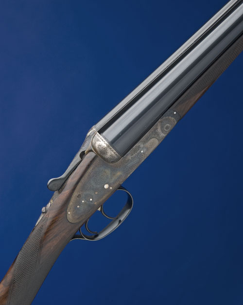 28in. nitro chopperlump barrels, the rib engraved 'BOSS & CO. 13/14, CORK STREET. LONDON. W1' (left wall thickness below recommended minimum) and scroll engraved at the breech end, 2 1/2in. chambers, bored approx. 1/4 and 1/2 choke, automatic safety with gold-inlaid 'SAFE' detail, removable striker discs, rolled-edge triggerguard, best fine bouquet and scroll engraving, retaining much original colour-hardening and finish, 15 1/4in. figured stock, weight 6lb. 10oz., in its lightweight leather case.