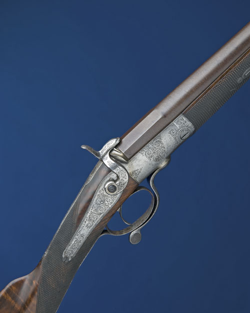 29 3/4in. shortened black powder only damascus barrel with faceted breech section, engraved 'E.M. REILLY & CO. NEW OXFORD STREET. LONDON.', Jones patent rotary-underlever, fluted fences, non-rebounding back-action lock, bold acanthus scroll engraving with feathered borders, brushed finish overall, 14in. highly-figured stock (with crack and repaired at hand) including steel buttplate, fore-end with sculpted horn finial, weight 5lb. 10oz.