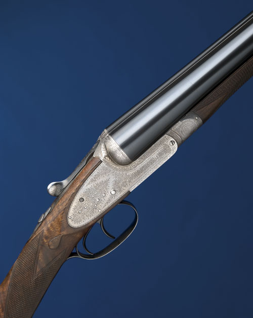 28in. sleeved nitro steel to damascus barrels, 2 1/2in. chambers, bored approx. 1/4 and 3/4 choke, carved fluted fences, toplever gold-inlaid '1', automatic safety with gold-inlaid 'SAFE' detail, removable striker discs, fine acanthus scroll engraving, brushed bright finish, 14 1/8in. well-figured replacement stock cast on for the left shoulder, weight 6lb. 19oz., the makers have kindly confirmed that this shotgun was completed August 1901.