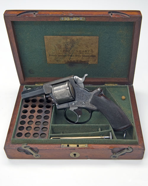 3in. blued octagonal sighted barrel, scroll engraved, top-strap engraved 'S. GRANT. ST. JAMES'S ST. LONDON.', case hardened border engraved cylinder, frame and trigger-guard scroll engraved, Tranter patent stamp and serial number to frame, spring cylinder axis pin retaining latch and swivel mounted cartridge extractor rod, chequered walnut grips with lanyard ring, retaining much original finish, Birmingham proof marks, in its original fitted mahogany case, lined in green baize with Stephen Grant trade label, fitted cartridge board, and accessories including James Dixon oil bottle, cleaning rod and key