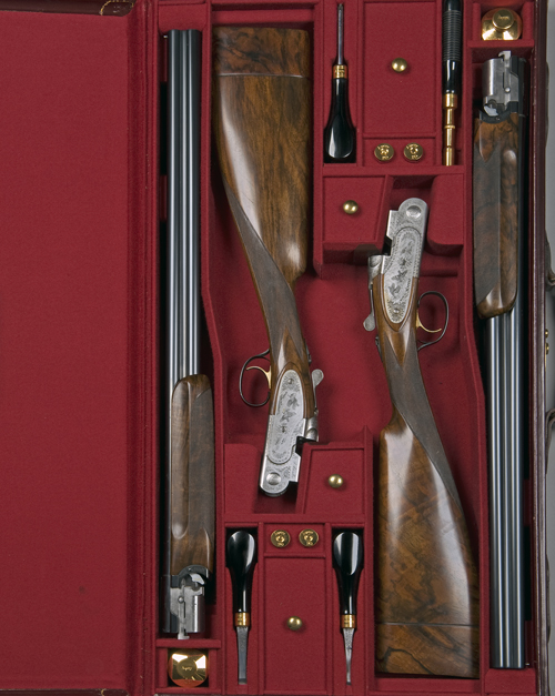 67cm nitro barrels with no top-ribs, silver bead fore-sights, 2 3/4in. chambers, bored approx. imp. cyl. and 1/4 choke, hold-open toplevers, automatic safeties with integral barrel selector switches, gold-washed triggers, actions and lockplates with bold acanthus scroll engraving surrounding scenes of mallard and English partridge, the undersides with a woodcock, triggerplates signed 'Bottega C. Giovanelli', bright finish overall, 15 1/8in. figured stocks with detachable 2 1/8in. wooden extensions, can be replaced with 1/2in. rubber recoil pads (in case) for 13 1/2in. pulls, weight 5lb. 14oz., in a custom made lightweight leather case with Asprey trade label, canvas outer and full complement of gold-washed Asprey accessories, comprising Asprey scroll-engraved turnscrews (one to fit butt screws), snap-caps, oil and solvent bottles, phillips-head screwdriver, chamber brush and cleaning rod, the case blocked to fit the guns at 15 1/8in. length, with provision to store the extensions and re-block the case to fit the guns when switched to 13 1/2in. length