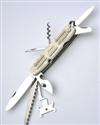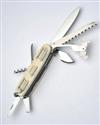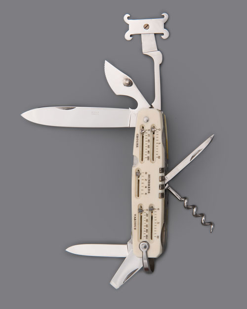 'ASPREY LONDON' named ivory scales with sliding counters marked in tens and hundreds and inscribed 'PHEASANTS, PARTRIDGES, GROUSE and VARIOUS', central 'HUNDREDS' counters, the back edges with a total of ten silver place-finder pegs, large and small penknife blades, flat head screwdriver, small serrated clip-point blade with thumb stud and bottle opener, cartridge extractor, awl with nail file, corkscrew and lanyard loop