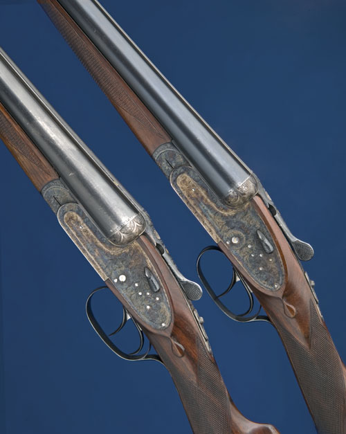 28in. nitro chopperlump barrels, ribs gold-inlaid '1' and '2', 2 3/4in. chambers, bored approx. true cyl. and 1/2 choke, engraved arcaded fences, toplevers gold-inlaid '1' and '2', automatic safeties, removable striker discs, hand-detachable lockplates, gold-inlaid cocking-indicators, articulated front triggers, rolled-edge triggerguards, acanthus scroll engraving, 14 7/8in. stocks including buttplates, weight 6lb. 10oz.