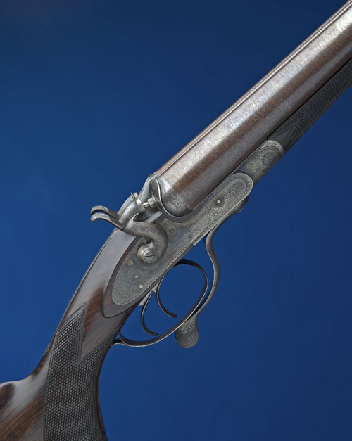 30in. nitro reproved damascus barrels, rib address indistinct, 2 5/8in. chambers, bored approx. true cyl. choke in both, carved serpentine fences, elongated top-strap, rebounding sidelocks with dolphin hammers, bold acanthus scroll engraving surrounding scenes of an English setter and a pointer flushing partridge, retaining some colour-hardening, replacement triggerguard, 14 1/4in. pistolgrip stock with steel pistolgrip-cap and buttplate, crosspin-release fore-end with carved horn finial, weight 8lb.