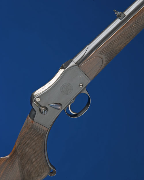 28in. nitro barrel with bead fore-sight, flip-up open sights, the action border engraved and with a tudor rose on either side, 15 1/4in. figured replacement pistolgrip stock, sling swivels