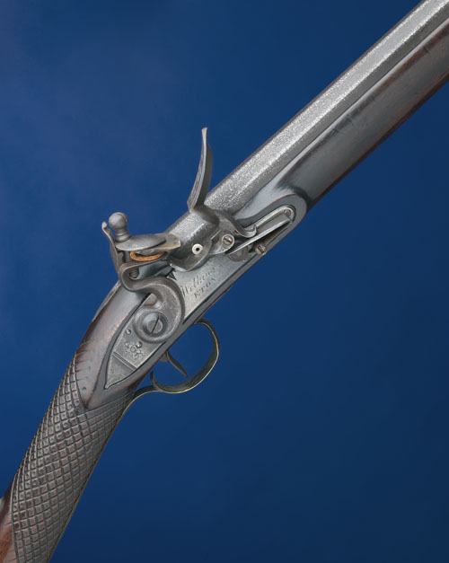 late 18th century, with 40 1/2in. slightly swamped two-stage barrel (pitted, relined touch-hole) with silver spider fore-sight, border and foliate engraved tang, lightly engraved flat bevelled lock signed 'WILKINS / ETON' and with stepped tail and large roller, walnut full stock (slender chip and some cracking to left side of fore-end at the muzzle) with chequered grip, engraved brass mounts including trigger-guard with shell finial (engraving worn), bone side-nail escutcheons, and brass-mounted ramrod with worm, Tower private proof marks, barrelsmiths mark 'RW'.