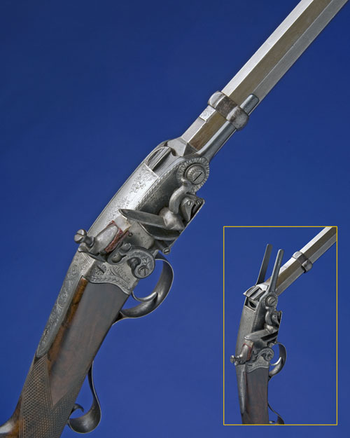 A BREECH LOADING SINGLE BARRELLED BOXLOCK FLINTLOCK SPORTING RIFLE OF APPROX .650 CALIBRE