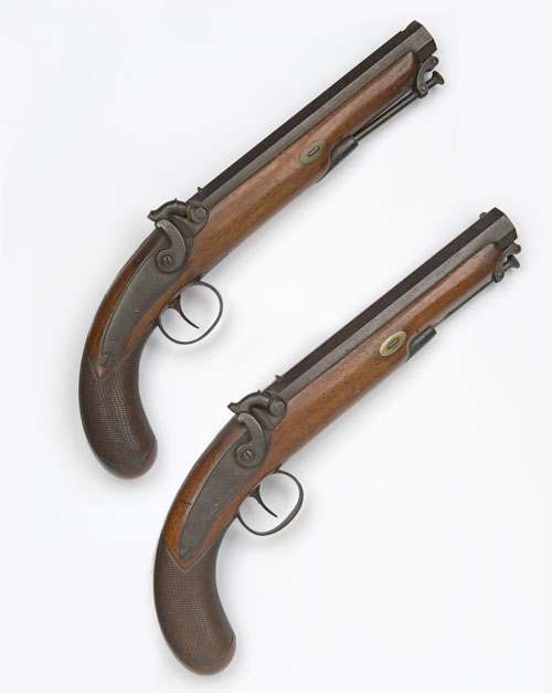 circa 1840, with 8in. octagonal sighted barrels each signed 'J.C. REILLY LONDON' on the top flat, border and scroll engraved breeches, tangs and back-action locks (both hammer spurs broken off), walnut three-quarter stocks each with chequered butt, border and scroll engraved trigger-guards, white metal escutcheons and barrel-bolt escutcheons, and iron stirrup ramrods (iron parts heavily discoloured throughout).