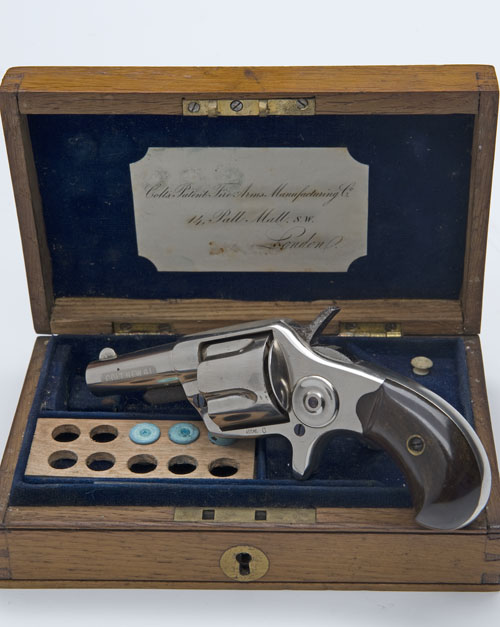 2 1/4in. barrel, long cylinder flutes and locking slots at the rear of the cylinder, retaining much nickel-plated finish, rosewood grips, in a re-lined oak case with reproduction label