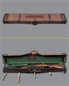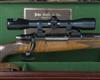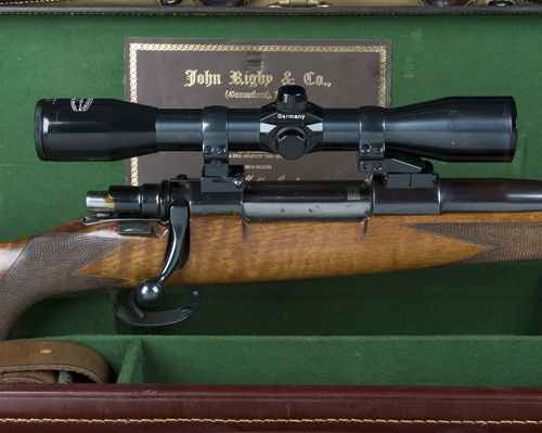 24in. blacked nitro barrel engraved 'JOHN RIGBY & CO. 13. PALL MALL, LONDON. S.W.1.', with block-mounted bead fore-sight with flip-over tunnel cover, block mounted rear-sight of one standing and two folding leaves calibrated to 300 yards, blacked receiver fitted with a Schmidt & Bender 4x36 telescopic sight in quickly-detachable mounts, with spare Zeiss diavari-ZA 2,5...10x52 telescopic sight, 13 3/4in. figured stock including 3/4in. rubber recoil pad, with fore-end cap, chequered grip and fore-end, steel pistolgrip cap with trap, cheekpiece, sling swivels, in its full length leather rifle case with provision for both telescopic sights, canvas outer