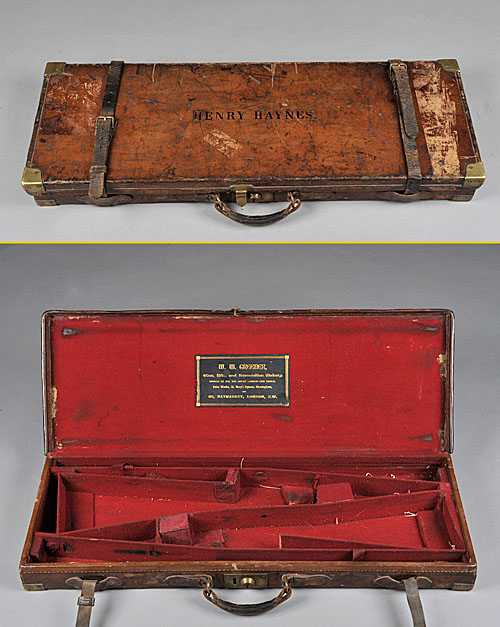 to accept 30in. barrels, burgundy baize interior (some mothing) carrying a W.W. Greener trade label, brass lock (key missing), some wear to straps, the lid impressed with the name 'HENRY HAYNES.'