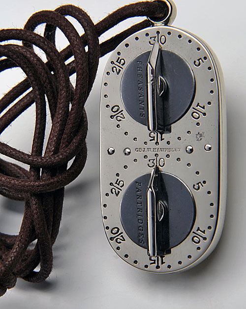 brass and nickel plate finish, four revolving counters engraved 'PHEASANTS, PARTRIDGES, RABBITS and HARES', one face marked 'G.& J. W. HAWKSLEY', lanyard loop with lanyard