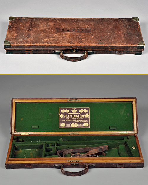 to accept 28in. barrels (would adapt to 30in.), green baize lined interior carrying a Joseph Lang & Son trade label, heavily patinated leather exterior with cartouche impressed with the monogram 'R.A. St. J.L.'