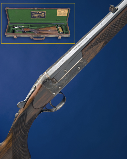 26in. black powder only octagonal barrel (proof marks for 1921), top flat partially matted and with open sights and folding leaf sights for 50, 100 and 150 yards, with silver-inlaid sighting lines, bead foresight, side flats engraved 'WILLIAM EVANS. 63. PALL MALL. ST. JAMES'S. LONDON. .250 BORE.', non-selective ejector, automatic safety with gold-inlaid 'SAFE' detail, carved teardrop fences, removable striker disc, fine border and bold acanthus scroll engraving, retaining virtually full original colour-hardening and much finish, 14 1/2in. boldly-figured pistolgrip stock with cheekpiece, engraved and colour-hardened pistolgrip-cap, Hackett-style snap fastener fore-end with horn finial, weight 5lb. 10oz., in its original brass-cornered canvas and leather case with some accessories, the lid exterior marked 'CAPT. N.J. BENGOUGH'