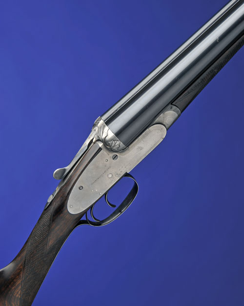 30in. black powder only (possibly blued damascus) barrels, rib engraved '2' (address worn), wall thicknesses below recommended minimum, 2 1/2in. chambers, bored approx. true cyl. and 3/4 choke, fences deeply carved in relief with stylised leaf motifs, automatic safety with gold-inlaid 'SAFE' detail, un-engraved action and lockplates, bright finish, 14 1/4in. highly-figured stock including steel buttplate, weight 6lb. 13oz.