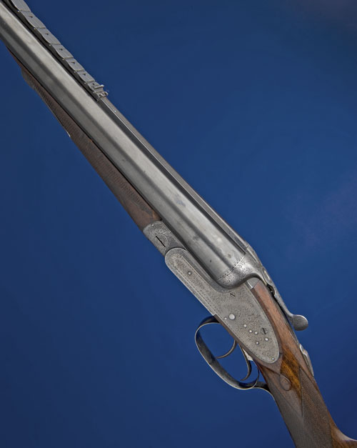 Scott's Improved Bolt treble-grip action, automatic safety, patent gas checks, the left striker with removable striker disc, best fine border and acanthus scroll engraving, retaining traces of original colour-hardening, 14 1/2in. figured stock including 5/8in. horn extension, sling swivels, fore-end with grip-catch release lever, weight 9lb. 3oz. (Cape barrels) and 6lb. 14oz. (shot barrels), in a brass-cornered leather case with provision for both sets of barrels