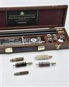 the fitted case containing brass-mounted ebonite cleaning rod with heads for 12 and 20-bore, Rangoon oil and cleaning patches, oil bottle and snap-caps for 12 and 20-bore.