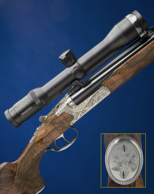 23 1/2in. blued nitro barrels with engraved ramp-mounted high visibility bead fore-sight, stippled sighting rib with open sights, fitted with a Swarovski 1,5-6x42 telescopic sight in quickly detachable mounts at the breech-end, the tubes engraved 'E. MATHELON HAUTE - SAVOIE', hold-open toplever, bolstered scoop-backed action with removable striker discs, manual safety, the action and furniture profusely carved with acanthus scrollwork on a matt background, the underside of the action engraved with a vignette two hounds, the triggerguard engraved 'FF' in script, 14 1/2in. highly-figured pistolgrip stock including buttplate, with palm-swell, steel pistolgrip cap engraved with a vignette of mouflon, boar, stag, muntjac and chamois, with sculpted cheekpiece, sling eyes, weight 9lb. 7oz. (including telescopic sight), in a vinyl case