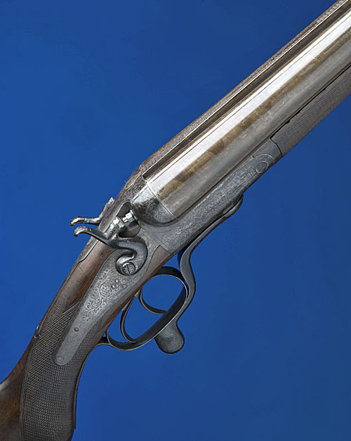 35in. damascus barrels, the matt rib engraved 'P.B. SHORTT', Jones patent rotary-underlever, rebounding back action locks (left hammer with extensive native repair), 14 1/2in. semi-pistolgrip stock (cracked at hand) with steel buttplate