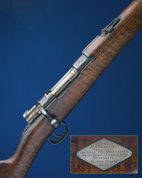 18 1/4in. blued nitro barrel (proved in 2010) with block-mounted blade fore-sight, rear ladder sight, blued receiver, the side wall marked 'MOD. MAUSER 1896. LUDW. LOEWE & Co. BERLIN.', matching numbers,13 1/4in. regulation stock with steel buttplate, cleaning rod, the left side of the stock with saddle-ring, the right side with plaque inscribed 'CHORD. W.A. BUSHMEN. MAUSER CAPTURED FROM BOER LAAGER KAFFIR KRAAL CROCODILE RIVER. TRANSVAAL. PLUMER COLUMN. 1900'