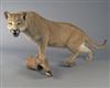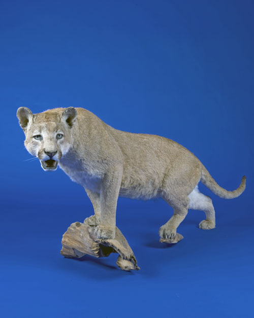 set in a hunting pose upon weathered wood mounts and 65in. from nose to tail.
