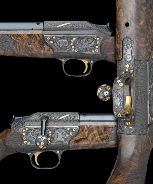 25in. blued nitro barrel with bead fore-sight and rear open sights, both mounted on colour-hardened florally carved ramp mounts with gold and silver inlaid flowers, the breech end fitted with a Zeiss Diavari M 2,5-10x50 telescopic sight in quickly detachable mounts, Blaser 'R93' straight-pull action profusely carved with acanthus scrollwork, gold-inlaid 'BLACK & FIRE' and 'BY R. GROIS', the bolt-handle with gold and silver highlighted efflorescence, the sides of the action with vignettes of mouflon and stag carved in relief, bordered by floral scrollwork with gold and silver accented flowers, the triggerguard bordered the same, surrounding carved vignettes of mountain goats, gold-washed trigger, 14 1/4in. highly-figured hogsback pistolgrip stock including 1/2in. rubber recoil pad, with horn-tipped chequered schnabel fore-end, chequered bird's head pistolgrip with horn pistolgrip cap, carved cheekpiece, sling swivels