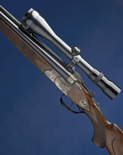 64cm nitro reproved Bohler Rasant-steel barrels (in 2010), with bead fore-sight, open rear sight, the breech-end fitted with a K. Kahles telescopic sight in quickly detachable mounts, 2 3/4in. shot chamber, bored approx. full choke, scroll-backed bolstered treble-grip action with sideclips, cocking indicators, shot / ball selector switch, manual side safety, set front trigger, border and partial scroll engraving, retaining some original colour-hardening and finish, 14in. figured pistolgrip stock including buttplate, with cheekpiece, pistolgrip cap, sling swivels, weight 10lb. 10oz.