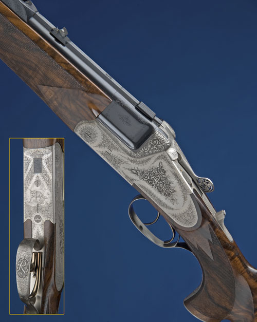 25in. nitro barrels with bead fore-sight, flip-over rear open sight, 3in. shot chamber, bored approx. 1/2 choke, with attachments for quickly detachable telescopic mounts, bolstered treble-grip action, pierced hold-open toplever, manual cocking piece, manual safety, set front trigger, hand-detachable sidelocks with concealed flush-fitting release catch, border engraving and carved with bouquets, the underside with a vignette of a fox, the triggerguard carved in relief 'PS', 14 1/4in. figured hogsback pistolgrip stock including 1/2in. rubber recoil pad, palm swell, sculpted cheekpiece, engraved skeletal steel pistolgrip cap, the ammunition trap with scroll engraving surrounding a vignette of a winged bearded roe-hare, sling swivels, weight 8lb. 9oz.