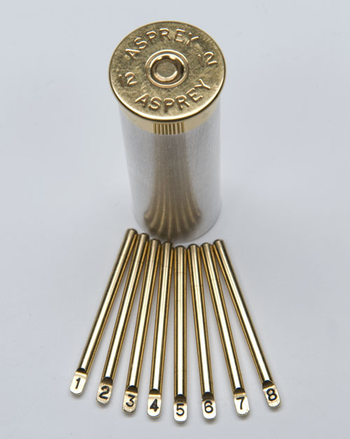 late design in silver and brass, of 12-bore cartridge form with eight numbered pegs, the 'wad card' with Asprey hand-etched serial number 'M14625', the base engraved 'ASPREY' and '12'
