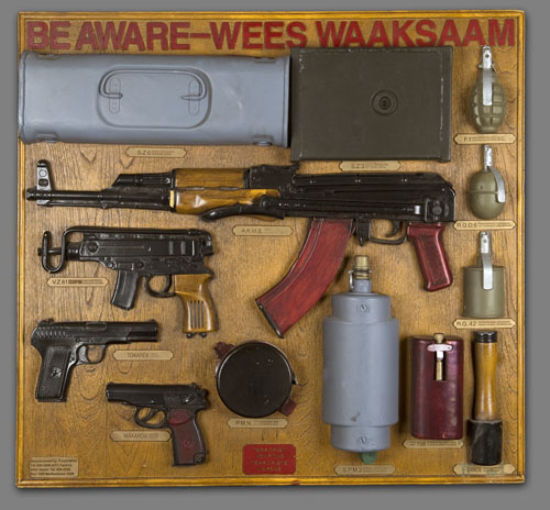 entitled "BE AWARE - WEES WAAKSAAM" and "TERRORIST WEAPONS / TERRORISTE WAPENS", showing a variety of pistols and assault weapons, grenades and other explosive devices, manufactured by Polyshields in polyurethane foam