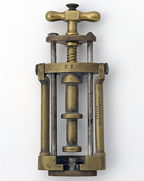 an unusual re- and de- capper in which screwing the thumb lever one way forces the de-capping needle down, screwing it the other way draws back the re-capping pillar