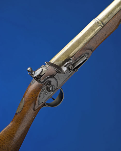 brass octagonal to round three-stage barrel signed 'DAYKIN NOTTINGHAM', belled muzzle, and fitted with spring bayonet above, iron tang incorporating bayonet release catch, flat bevelled border engraved lock signed 'DAYKIN', possible replacement walnut half-stock with later ramrod, brass mounts, the triggerguard with acorn finial, Birmingham proof marks