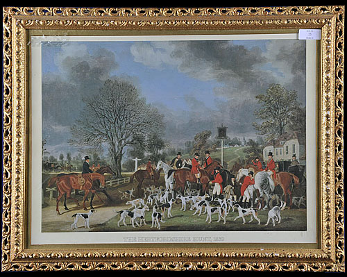 A FRAMED PRINT OF 'THE HERTFORDSHIRE HUNT, 1839', of 28 1/2in. x 22 1/2in. and in a gilt filigree frame, this modern print depicts The Hertfordshire meeting before a days hunting.