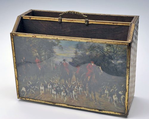 A HUNTING THEMED NEWSPAPER AND MAGAZINE RACK, of wooden construction with embossed overlaid gilt panels (some loss of finish) with two compartments and carrying handle, the front panel showing the hunt departing.