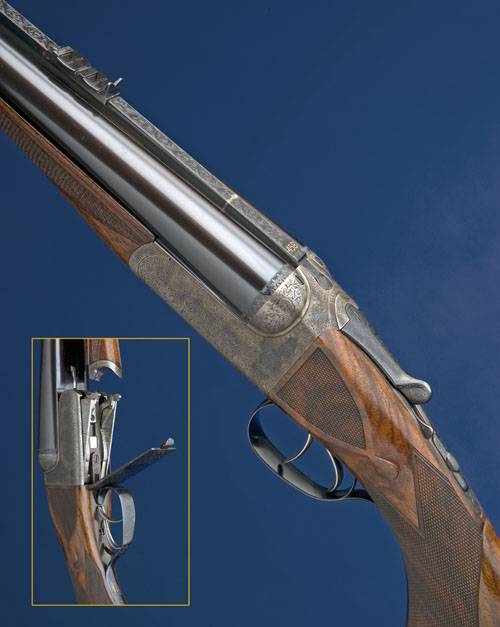 24in. replacement nitro chopperlump barrels (by the makers in 1974), with acanthus scroll engraved sight-rib, with '.458' calibre designation gold-inlaid at the breech end, open sights with folding leaf sights for 150, 200 and 300 yards, block-mounted bead foresight with flip-up moonsight and scroll engraved fold-over protector, sunken rib gold-inlaid 'WESTLEY RICHARDS & CO.' and engraved 'ENGLAND.', treble-grip action incorporating J. Deeley and L.B. Taylor patent hand-detachable locks, patent no. 17731 of 28th July 1897, use number 2450, hinged floorplate, striker discs, bolted automatic safety with gold inlaid 'SAFE' and 'BOLTED' details, Westley Richards patent toplever, fully engraved with fine acanthus scrollwork, the floorplate with a prowling tiger in a jungle setting, retaining virtually full renewed colour-hardening and finish, 15in. boldly-figured replacement pistolgrip stock with chequered side-panels, sculpted cheekpiece forming a high comb, sling swivels, scroll-engraved pistolgrip-cap (with trap), and including 1in dark wood extension and 7/8in. rubber recoil pad, fore-end with matching replacement wood with horn finial, Deeley & Edge patent release lever, weight 11lb. 3oz., in its brass-cornered leather case