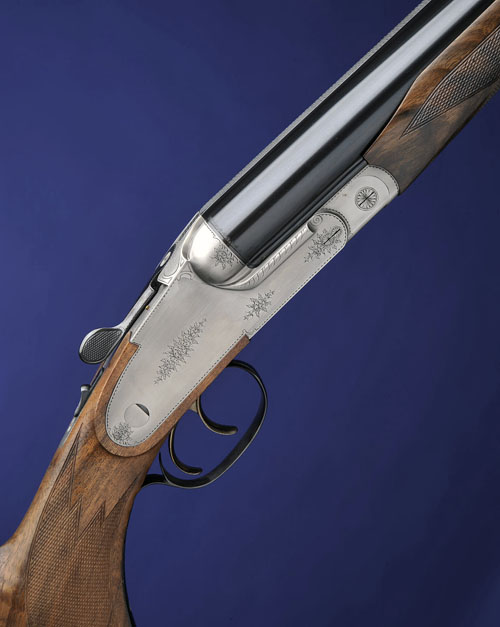 24 1/4in. nitro barrels with matt sight rib, open sights for 50, 100 and 150 yards, ramp-mounted foresight, treble-grip back-action, manual safety, gold cocking indicators, partially engraved with scrollwork, brushed bright finish overall, 14 3/4in. well-figured pistolgrip stock with cheekpiece, blued steel pistolgrip-cap and including 1in. rubber recoil pad, beavertail fore-end, sling eyes weight 10lb. 6oz.