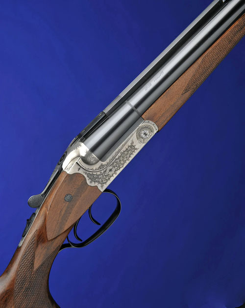 23 5/8in. (60cm.) nitro monobloc barrels with raised matt sight rib, open sights and folding leaf sights marked '50' and '75', ramp-mounted gold bead foresight, scroll-back treble-grip action with side-bolsters, removable striker discs, automatic safety, articulated front trigger, scroll engraved action, bright and blued finish, 14 3/8in. figured pistolgrip stock with cheekpiece, and including 5/8in. rubber recoil pad, weight 10lb. 10oz., in its original carton with paperwork