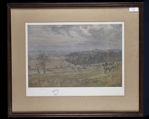 A FRAMED AND PENCIL-SIGNED HUNTING PRINT BY LIONEL EDWARDS, printed and published by Eyre & Spottiswoode, 28in. x 23in. including wood frame, single mounted and one of a series of the depictions of hunting countries Edwards painted during the 1930s.