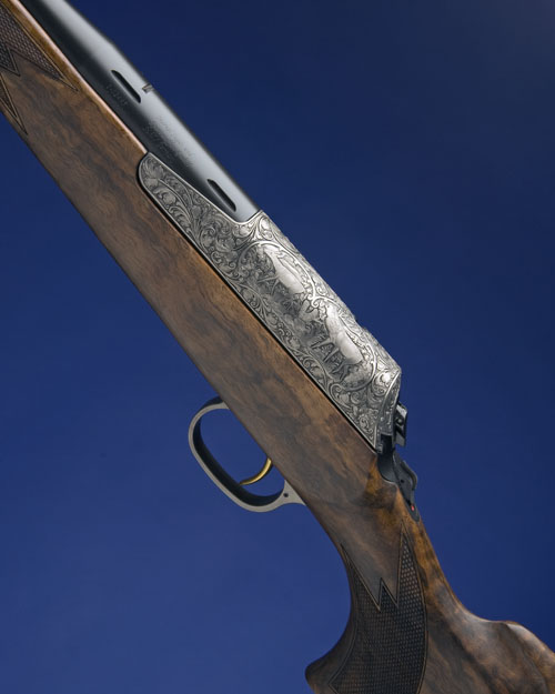 21 1/2in. blued round nitro barrel with ramp-mounted blade fore-sight, ramp-mounted rear open sight, gold titanium nitride plated bolt-head, the bolt-shroud carved with foliate scrollwork on a matt background surrounding a vignette of stag and doe in their naturalistic habitat, hinged triggerplate carved with foliate scrollwork on a matt background surrounding a cartouche with the makers name, gold titanium nitride plated set-trigger, three-stage manual safety, 14 1/4in. figured hogsback pistolgrip stock including 1/2in. rubber recoil pad, with rosewood schnabel fore-end tip, chequered grip and fore-end, sculpted cheekpiece, sling swivels, in its makers carton