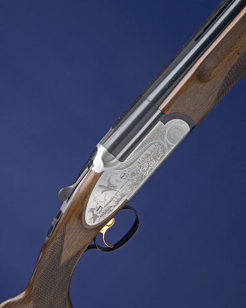 28in. nitro barrels with 10mm ventilated matt top-rib, 3in. chambers, multichoke (with spares), hold-open toplever, manual safety with integral barrel selector switch, gold-washed single-trigger, acanthus scroll engraving surrounding fowl scenes, silver finish, 14 1/2in. pistolgrip stock including buttplate, sling swivels, weight 7lb. 4oz., in its makers carton