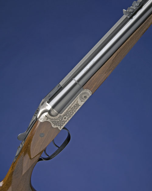 23 5/8in. nitro monobloc barrels with broad matt rib, ramp-mounted bead fore-sight, rear sight of one standing and two folding leaves calibrated to 75 metres, the breech end with facility for a scope base, bolstered scroll-backed treble-grip action, automatic safety removable striker discs, articulated front trigger, action with scrollwork, 14 3/8in. figured pistolgrip stock including 5/8in. rubber recoil pad, sling swivels, weight 11lb. 7oz., in its makers carton