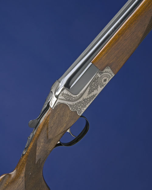 26 3/4in. nitro barrels with 8mm matt top-rib, 3in. chambers, multichokes (with spares), bolstered scroll-backed action, hold-open toplever, manual safety, selective single-trigger, partial acanthus scrollwork on a matt background, bright finish, 14 1/4in. pistolgrip stock including buttplate, cheekpiece, sling swivels, weight 6lb. 10oz., in its makers carton