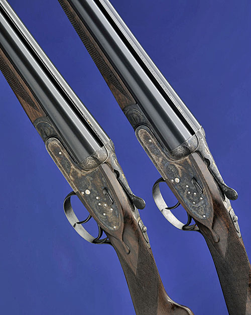 28in. nitro chopperlump barrels, ribs scroll engraved at the breech ends and gold-inlaid '1' and '2', 2 3/4in. chambers, bored approx. imp. cyl. and 1/4 choke (No.1) and 1/4 and 1/2 choke (No.2), automatic safeties with gold-inlaid 'SAFE' details, toplevers gold-inlaid '1' and '2', removable striker discs, hand-detachable lockplates, gold-inlaid cocking-indicators, articulated front triggers, rolled-edge triggerguards, bouquet and scroll engraving, retaining virtually full original colour-hardening and finish, 14 5/8in. slightly cast on figured stocks, weight 6lb. 7oz. The guns appear to be lightly used