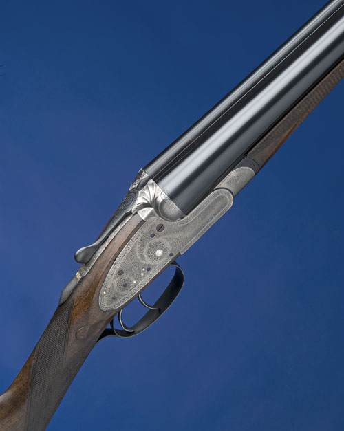 28in. nitro reproved (in 2010) sleeved barrels, rib engraved 'ARMY & NAVY C.S.L. LONDON.', 2 3/4in. chambers, bored approx. true cyl. choke in both, treble-grip action with carved stylised leaf fences, manual safety with silver 'SAFE' detail, removable striker discs, best bouquet and scroll engraving, brushed bright and reblued finish overall, 14 1/2in. figured stock (slight crack at hand) with engraved steel heel and toe plates, weight 6lb. 4oz.