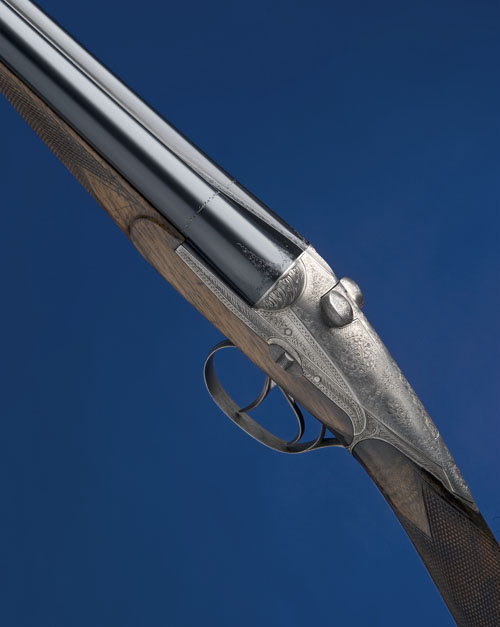25 5/8in. (65cm) nitro monobloc barrels with sunken matt top rib and no under rib, scroll engraving at the breech end, 9 punch marks, some pitting, 2 1/2in. chambers, bored approx. 3/4 choke in both, sprung sliding-breech with converging obturator discs, button barrel release (requires attention), manual side safety, bouquet and scroll engraving with carved leaf fences, bright finish overall, 14 3/8in. figured stock including horn buttplate, weight 5lb. 8oz.